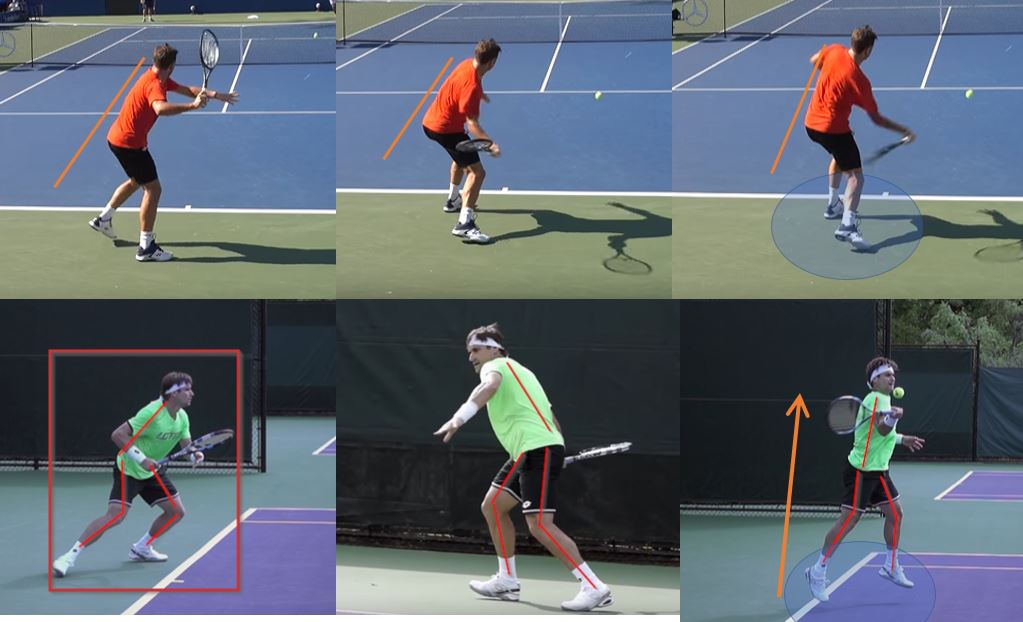 There may be situations where dynamically changing your posture is necessary during the shot. For instance, maybe you need to rise up to a high ball, or you need to lean and reach to a ball. Note how the racquet face angle can change by simply changing your posture (spine angle).